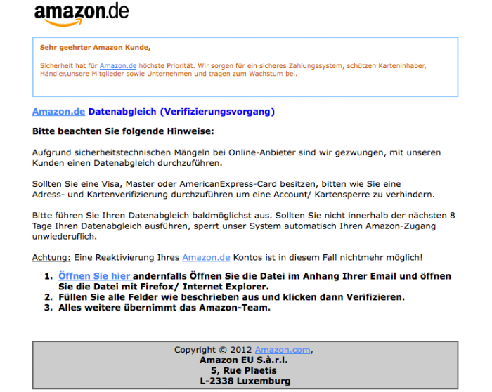 Eine bereits im Sommer verbreitete Phishing-Mail, ist aktuell wieder im Umlauf und diese stammt angeblich von Amazon. Sie ist nahezu perfekt gemacht und daher so gefährlich. Mit dem Betreff „Datenabgleich für alle Amazon.de Kunden“ soll man dazu aufgefordert werden, die HTML Datei im Anhang zu öffnen und die Daten auszufüllen, die zur angeblichen Verifizierung notwendig sind.
