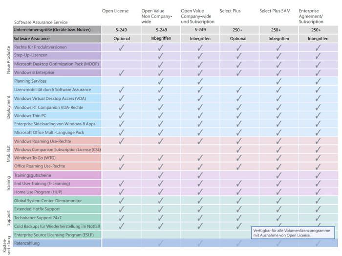 Mit dem Software Assurance erhält der Kunde nicht nur ein Upgrade-Recht, sondern zusätzliche Trainings-Gutscheine und erweiterten 24*7 Support. Die Vorteile gelten aber nicht für alle Produkte und Lizenztypen und um sich einen besseren Überblick zu verschaffen, empfehle ich die angebotene interaktive PDF Datei.