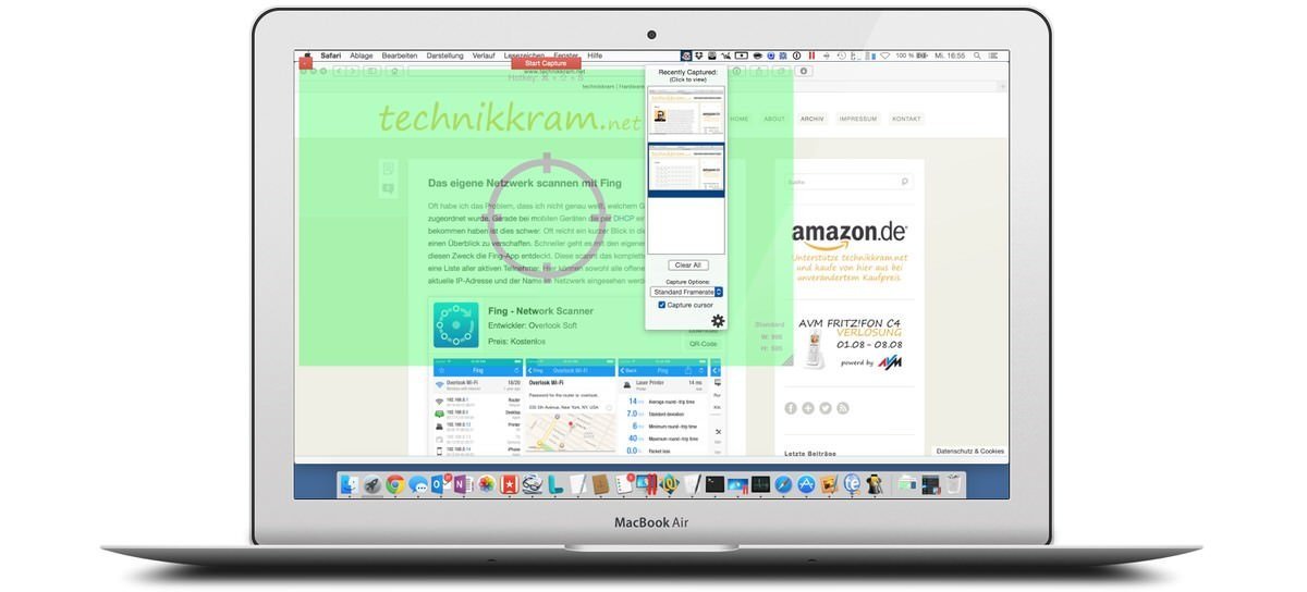 Die Bedienung ist kinderleicht und das Tool nistet sich in der Menüleiste vom Mac ein und die Aufnahme kann von dort aus per klick auf das Icon, oder mit dem Shortcut CMD + Shift + S gestartet werden. Der aufzunehmende Bereich lässt sich mit der Maus individuell anpassen und über das Menüleisten-Icon kommt man auch an seine Aufnahmen. Diese lassen sich dann betrachten, in der Länge bearbeiten, abspeichern und auch direkt per kostenlosem Webdienst mit anderen teilen.