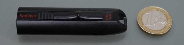 Bei dem SanDisk Extreme handelt es sich um einen USB Stick in der ganz klassischen Bauform. Im folgenden Bild seht ihr einen Vergleich mit einer 1-Euro Münze:
