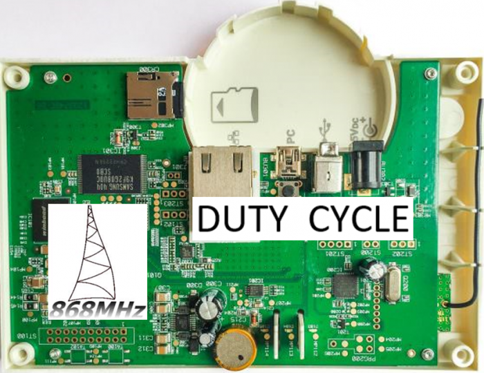 In dem von uns genutzten Frequenzbereich 868 MHz beträgt die maximale Sendezeit eines jeden Gerätes 1 % einer Stunde (36 Sekunden in einer Stunde). Die Geräte dürfen bei Erreichung des 1 %- Limits nicht mehr senden, bis diese zeitliche Begrenzung vorüber ist.)