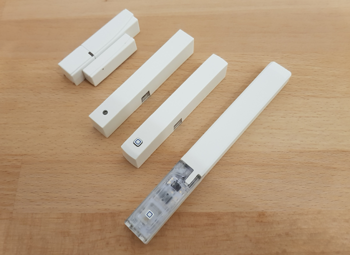 eQ-3 Fenster- und Türkontakte von links nach rechts: HomeMatic magnetischer Sensor; HomeMatic optischer Sensor; HomeMatic IP optischer Sensor; HomeMatic IP optischer Sensor verdeckter Einbau.