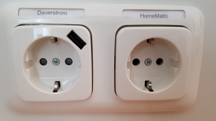 - Nach der Fertigstellung der elektrischen Installation hat man dann zwei Steckdosen nebeneinander. Eine mit Dauerstrom und eine zweite smarte Steckdose über HomeMatic steuerbar.