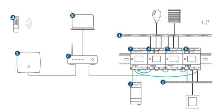 \nRechts sind die wired-Komponenten aufgebaut. An den Baugruppen hängen dann alle elektrischen Verbraucher wie z.B. Rollos, Lampen, Steckdosen usw. (eine Übersicht der verfügbaren Baugruppen findet Ihr hier).