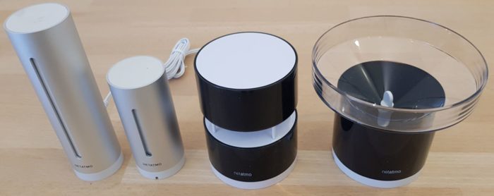 Die Netatmo Wetterstation besteht in der vollen Ausbaustufe über eine Basisstation (innen), einem Zusatzsensor (innen & außen), einen Regenmesser und einem Windmesser.