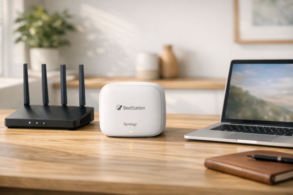 Synology BeeStation auf Schreibtisch neben Router und Laptop“ class=“introduction-image“ style=“display:block;margin:auto;“ />