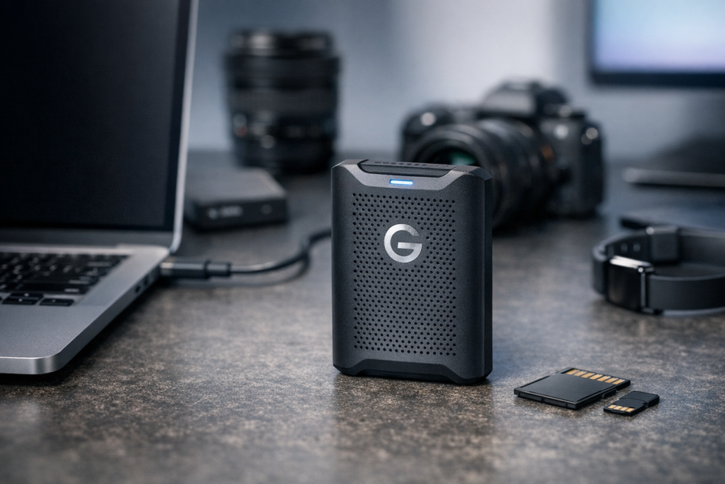 SanDisk G-Drive SSD📦 auf modernem Schreibtisch neben Laptop und Kamera“ class=“introduction-image“ style=“display:block;margin:auto;“ />
