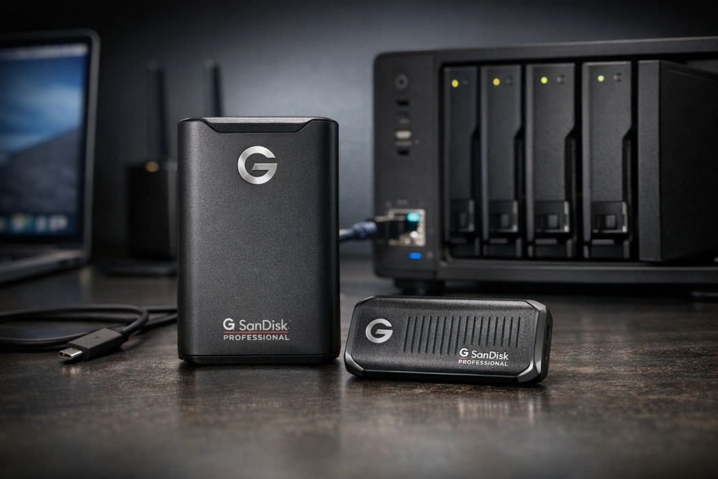 SanDisk Professional G-Drive SSD📦 neben Synology NAS🛒 und Laptop auf Schreibtisch“ class=“introduction-image“ style=“display:block;margin:auto;“ />