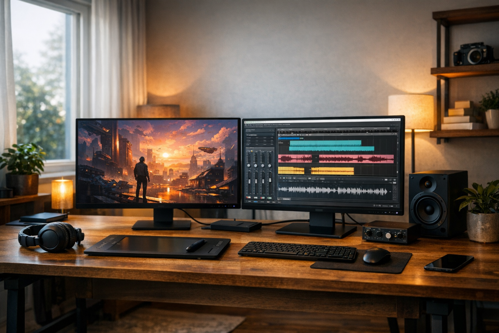 Wer lieber lokal arbeitet, installiert Python und die passenden Bibliotheken. Wichtig ist, dass eine leistungsfähige GPU mit CUDA-Unterstützung vorhanden ist. Anschließend lassen sich Modelle herunterladen und mit eigenen Prompts ansteuern. Die Prompt-Gestaltung ist dabei der kreative Kern: Ein präziser Prompt wie „futuristische Stadt bei Sonnenuntergang im Stil von Syd Mead“ führt zu deutlich besseren Ergebnissen als ein vager Begriff wie „coole Stadt“. Parameter wie Auflösung, Stil oder Detaillierungsgrad lassen sich anpassen. In der Musik beeinflussen Tempo, Instrumentierung und Emotion das Resultat. Nach der Generierung folgt die Feinabstimmung: Die Ergebnisse können in Bild- oder Audioeditoren bearbeitet werden – etwa um Übergänge zu glätten, Details zu schärfen oder eigene Akzente zu setzen. Diese Kombination aus KI-Ausgabe und menschlicher Nachbearbeitung führt zu besonders ausdrucksstarken Ergebnissen.