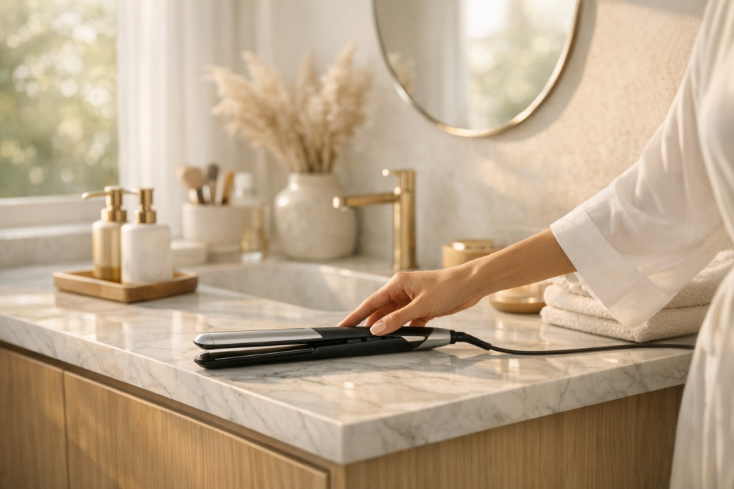 Die Ersteinrichtung des Corrale™ ist erfreulich einfach. Nach dem Auspacken lädt man das Gerät vollständig auf – nach etwa einer Stunde ist der Akku voll. Anschließend lässt sich das Glätteisen kabellos nutzen, was für mich besonders beim Styling in verschiedenen Räumen ein echter Gewinn ist. Das Bedienfeld ist übersichtlich gestaltet: Mit einem kleinen Schieberegler wählt man die gewünschte Temperaturstufe (165 °C, 185 °C oder 210 °C). Eine LED-Anzeige signalisiert, wenn die gewählte Hitze erreicht ist. Die Aufheizzeit ist erstaunlich kurz – in weniger als einer Minute ist das Gerät einsatzbereit. Im Alltag zeigt sich der Unterschied zur Konkurrenz deutlich. Durch die flexiblen Kupferplatten werden die Strähnen gleichmäßig geglättet, ohne dass man mehrfach über dieselbe Partie fahren muss. Ich habe feines Haar, das schnell austrocknet, und war überrascht, wie weich und glänzend es nach dem Styling blieb. Auch nach mehreren Wochen täglicher Nutzung konnte ich keinen typischen „Hitzeschaden“ feststellen. Ein nettes Sicherheitsdetail ist die automatische Abschaltfunktion: Nach 10 Minuten Inaktivität schaltet sich der Corrale™ selbstständig ab. Gerade für Morgenmuffel wie mich ist das eine beruhigende Funktion. Auch das Cool-Down-System und die Transportverriegelung machen das Gerät reisetauglich – ein Punkt, der mir als Vielreisende sehr wichtig ist.