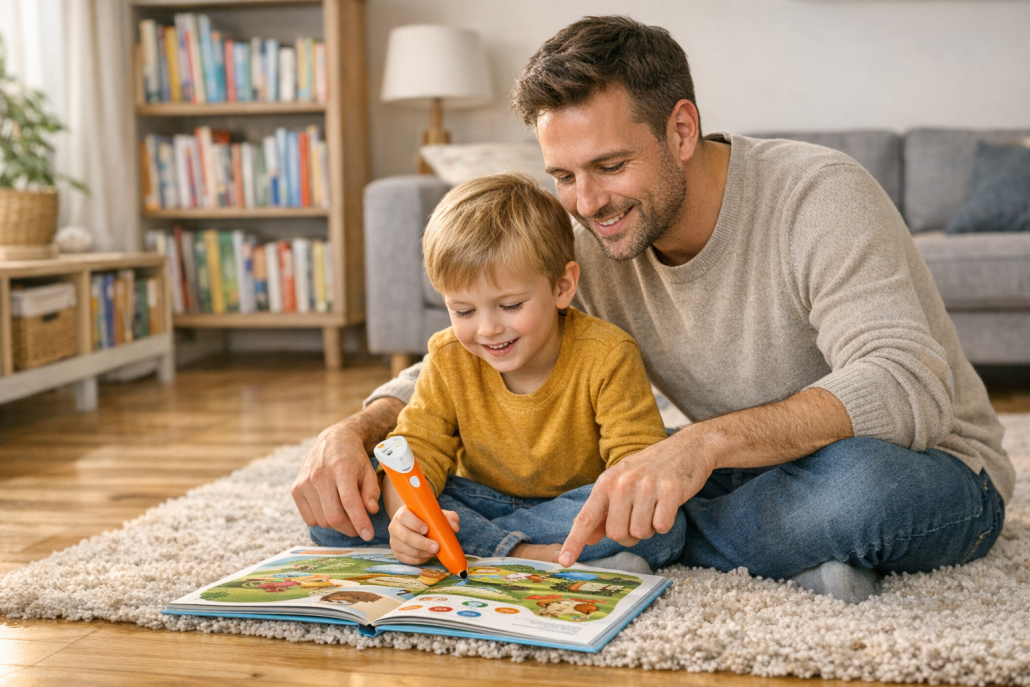 - Gemeinsames Entdecken: Papa und Kind sitzen zusammen und tippen auf Figuren, Tiere oder Gegenstände im Buch. Der Stift erzählt Geschichten, stellt Fragen oder spielt Geräusche ab. Das Kind lernt dabei, zuzuhören und zu reagieren – Papa kann ergänzen, erklären oder selbst Quizfragen erfinden.