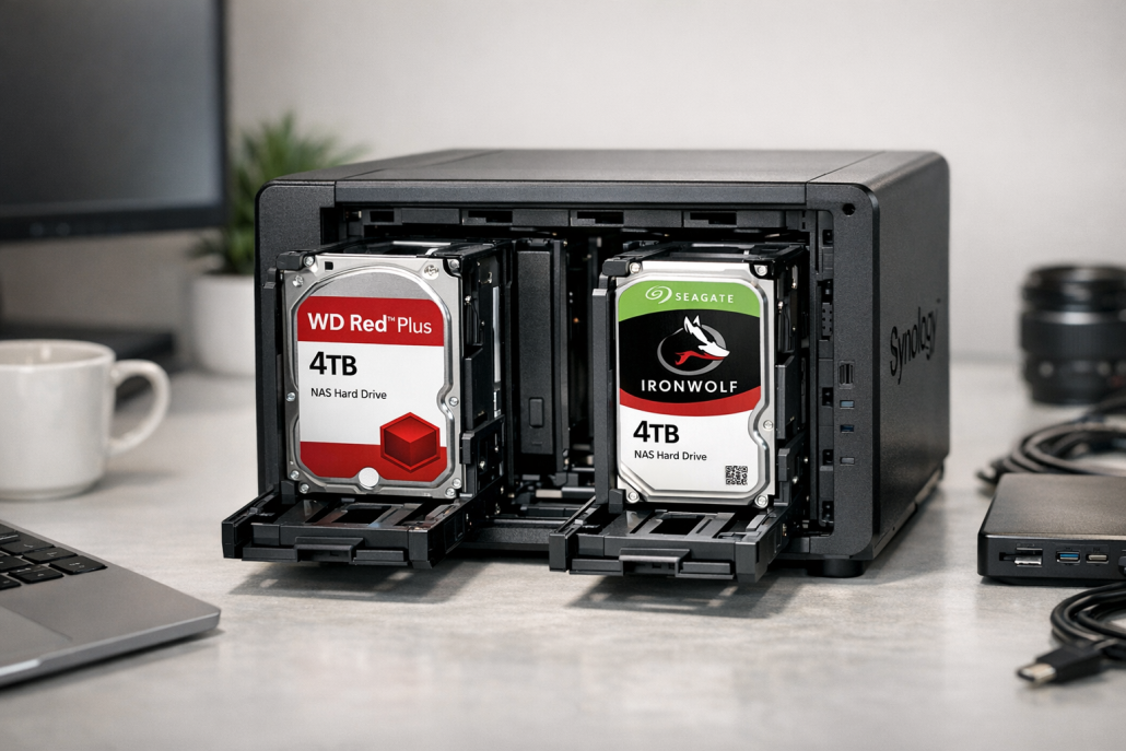Der Einbau einer WD Red Plus ist unkompliziert: Einschub auf, Platte rein, fertig. Danach übernimmt das NAS-Betriebssystem die Einrichtung. Wichtig ist, die Kompatibilitätslisten der NAS-Hersteller zu prüfen – sowohl Synology als auch QNAP führen WD Red Plus-Modelle offiziell. Nach der Initialisierung wird das Laufwerk formatiert, anschließend kann ein Speicherpool erstellt werden. Je nach Anwendungsfall eignen sich folgende Setups: