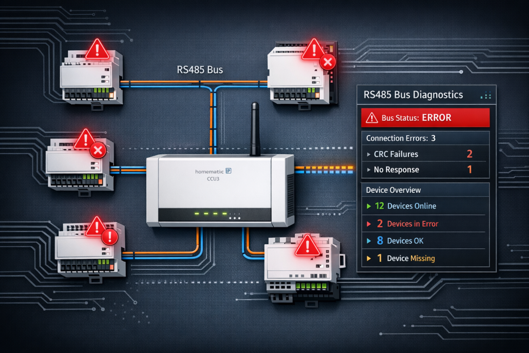 Die Realität: CCU3 zeigt RS485-Busfehler nur indirekt über ‚Gerät nicht erreichbar‘ oder Timeouts. Echte Busdiagnose funktioniert nur über SSH mit ‚dmesg | grep -i rs485‘ oder ‚/var/log/messages‘. Detaillierte Analyse erfordert externe RS485-Analyzer oder Oszilloskop.