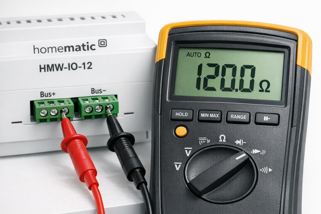 Die Realität: Homematic Wired Bus benötigt ZWEI 120Ω Widerstände – einen an jedem physischen Ende der Busleitung. Mit dem Multimeter prüfbar: Der Widerstand zwischen A+ und B- muss 60Ω betragen (120Ω || 120Ω = 60Ω).