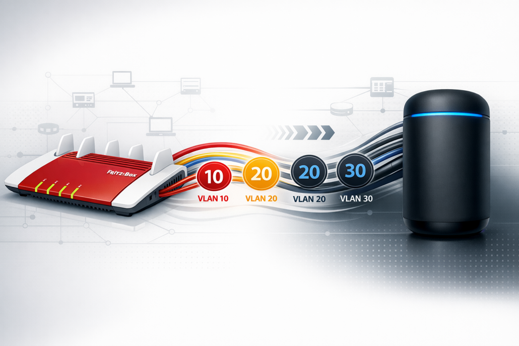 Die technische Realität: Fritz!Box verwendet proprietäre VLAN-Implementierung mit GUI-basierten „Heimnetz“-Segmenten, während UniFi explizite 802.1Q VLAN-Tags erfordert. Fritz!Box VLAN-IDs (1-8) müssen manuell auf UniFi-Netzwerke gemappt werden.