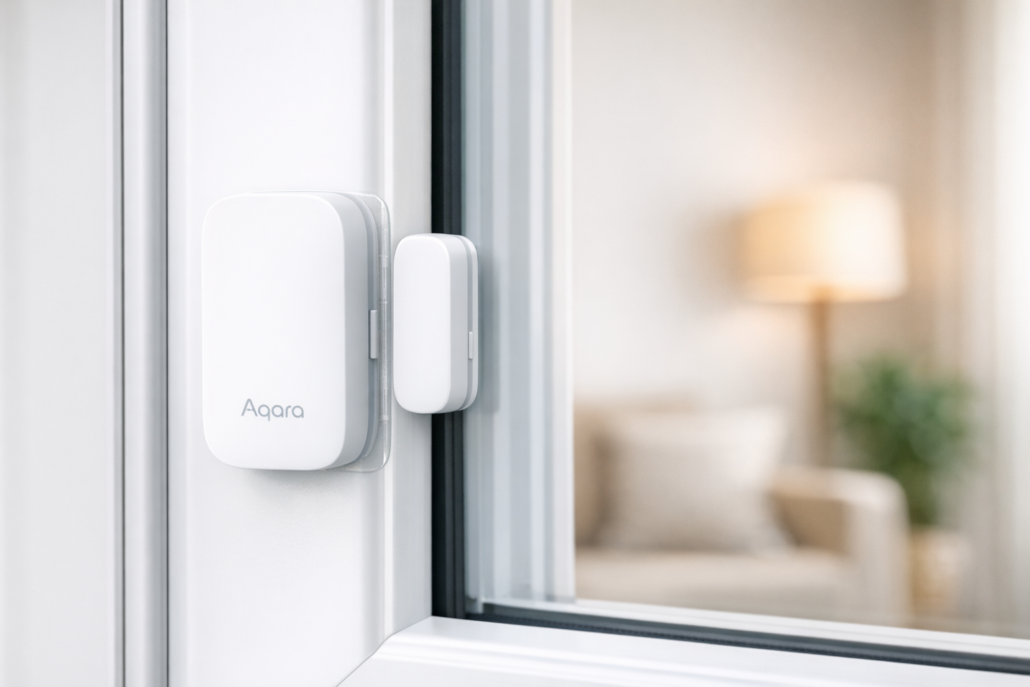 Der Hauptsensor kommt an den Fensterrahmen, der kleine Magnet an den beweglichen Fensterflügel. Sobald sich das Fenster öffnet, verlieren die beiden Teile den Kontakt und dein Smartphone bekommt sofort eine Nachricht. Bei meiner ersten Installation habe ich den Fehler gemacht, den Magneten zu weit weg zu kleben — das führte zu ständigen Fehlalarmen.