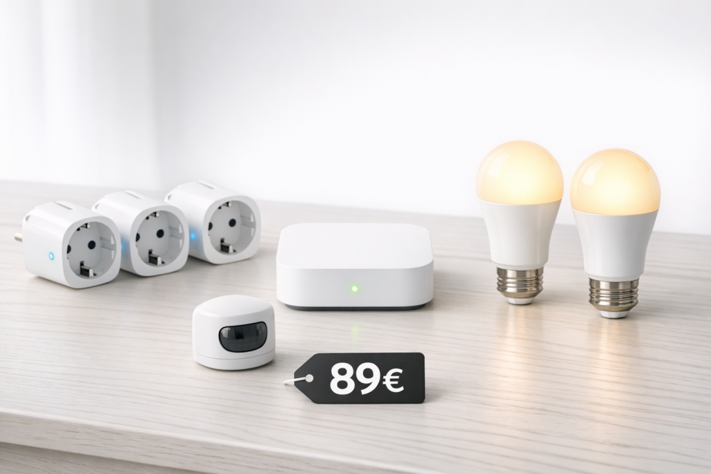 Für 100 Euro bekommst du: Zigbee-Hub (30€), 2-3 smarte Steckdosen (30€), 2 LED-Lampen (20€) und 1 Bewegungsmelder (15€). Diese Kombination deckt Beleuchtung, Gerätesteuerung und Automatisierung ab – perfekt als Smart Home Starter-Set.