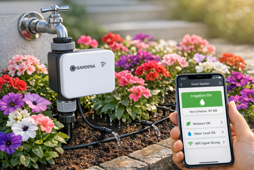 Dein Blumenbeet bewässern per App kostet ab 150 Euro und ist in 30 Minuten ohne Werkzeug eingerichtet. Mit einem Gardena Smart Water Control (ab 120 Euro) plus Bodenfeuchtesensor (30 Euro) steuerst du die Bewässerung vom Sofa aus und sparst bis zu 40% Wasser gegenüber manueller Bewässerung.