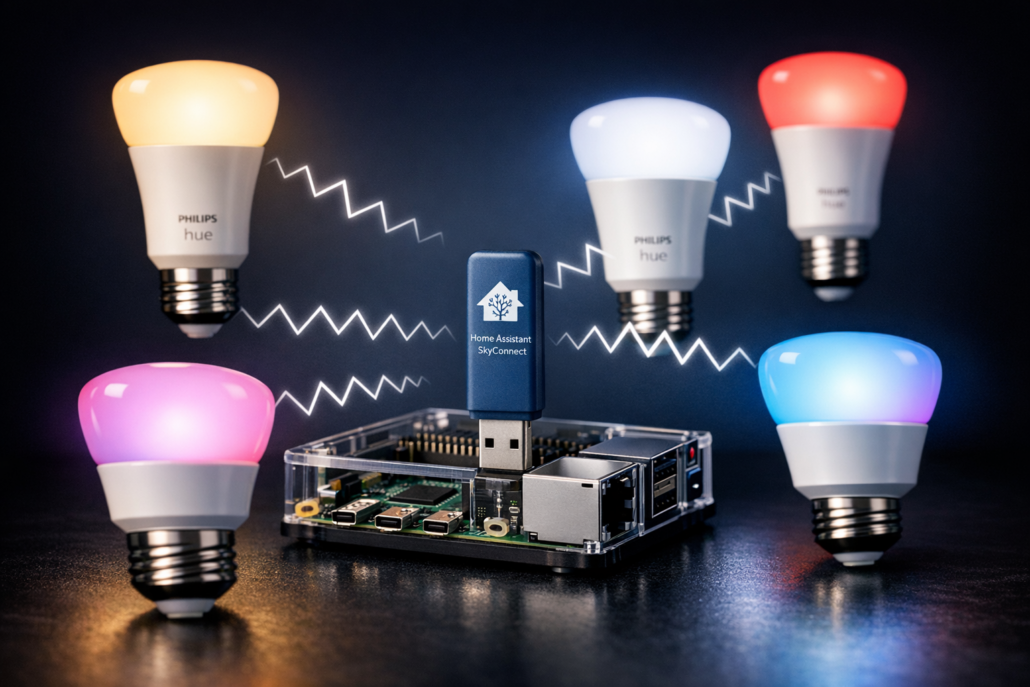 Das Szenario kennst du vielleicht: Du hast bereits Home Assistant laufen und willst deine Hue Lampen dort einbinden, ohne eine zusätzliche Bridge zu. Oder deine Bridge ist defekt und du suchst nach einer Alternative. Mit einem Zigbee-Coordinator wie dem SkyConnect verbindest du bis zu 50 Hue Lampen direkt mit Home Assistant — ohne Umweg über die Philips-Software.