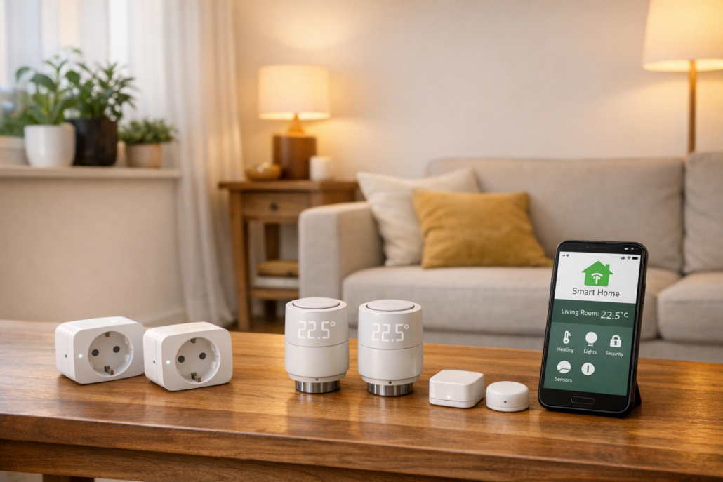 Das Geheimnis liegt in drei kabellosen Technologien: Smarte Steckdosen ersetzen teure Lichtschalter-Installationen, Aufsteck-Thermostate regulieren die Heizung ohne Schrauberei am vorhandenen Ventil, und Klebesensoren überwachen Türen und Fenster mit rückstandsfrei entfernbaren Klebepads. Alles steuerst du über eine einzige Smartphone-App — kein technisches Vorwissen nötig.