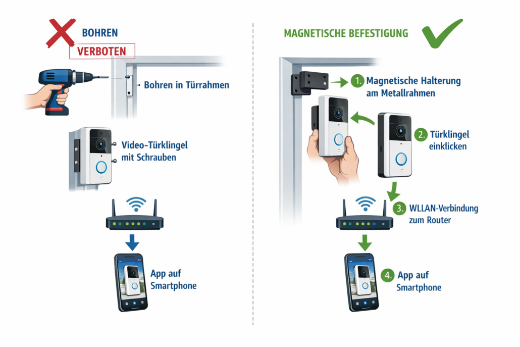 Die Realität: Magnethalterungen funktionieren nur an ferromagnetischen Materialien (Stahl). Aluminium-, Holz- oder Kunststofftüren sind nicht magnetisch. Selbst bei Stahltüren können Lackschichten oder Rost die Haftkraft drastisch reduzieren. Diebstahlrisiko: Magnethalterungen bieten null Schutz vor Diebstahl — jeder kann die Klingel einfach abziehen.