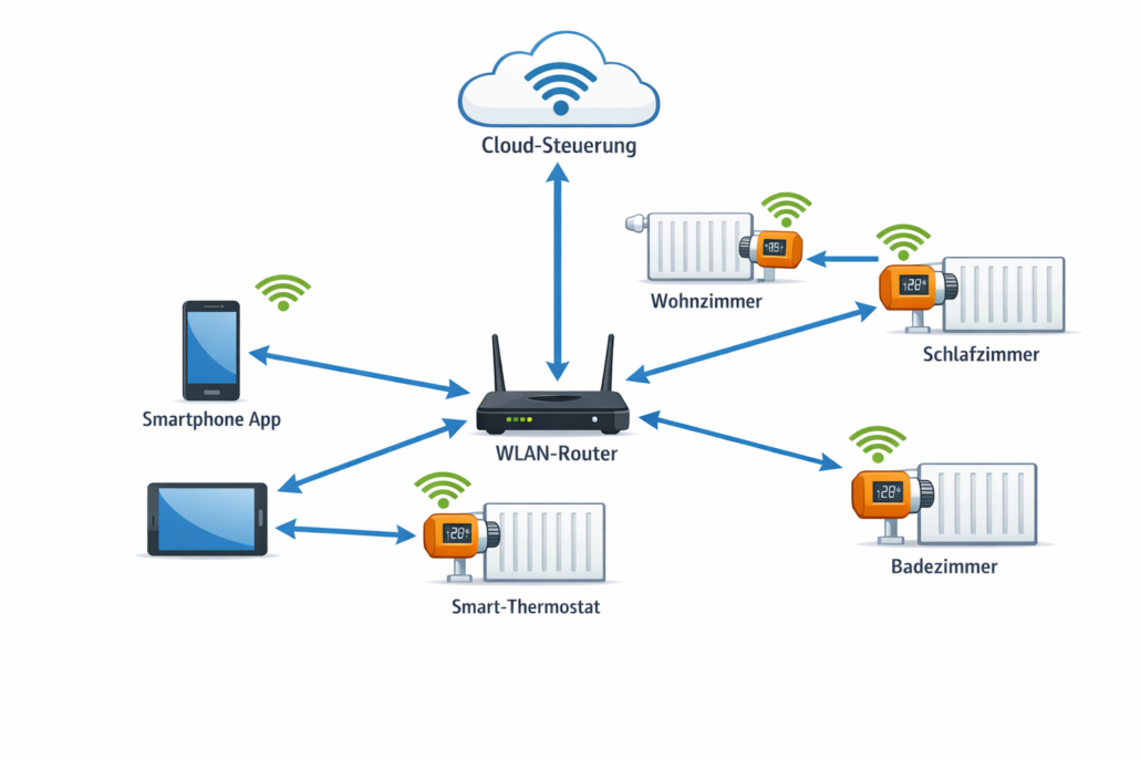 Übersicht der Smart-Home Heizungsvernetzung mit WLAN-Router und Smartphone-App