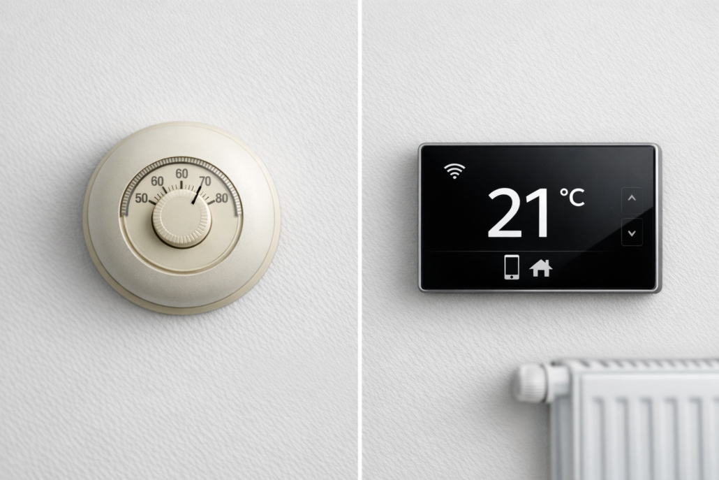 Modernes smartes Thermostat neben traditionellem analogen Modell – der Unterschied in Funktionalität und Design