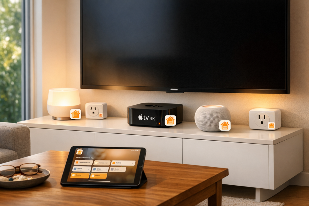 HomeKit Automation: Tagesabläufe automatisieren – Apple TV 4K als HomeKit Hub in modernem Wohnzimmer mit verschiedenen Smart Home Geräten